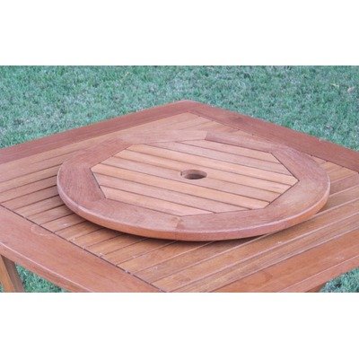TT-LS-002-20 Features: -20'' Outdoor wooden swivel server. -Equipped with an umbrella hole. -Just put it on any outdoor wooden table and make serving drinks and other things as easy as possible. -Made from premium Balau outdoor hardwood. -Complete weatherproof outdoor protection. -UV light fading system. -Dimensions: 1'' H x 20'' W x 20'' D.